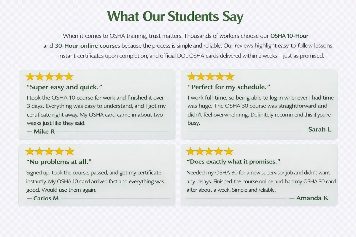 Yes. Upon successful completion of the course, you will receive an official OSHA DOL card via mail. Digital completion certificates are available immediately, while the physical card is typically delivered within 2–4 weeks.